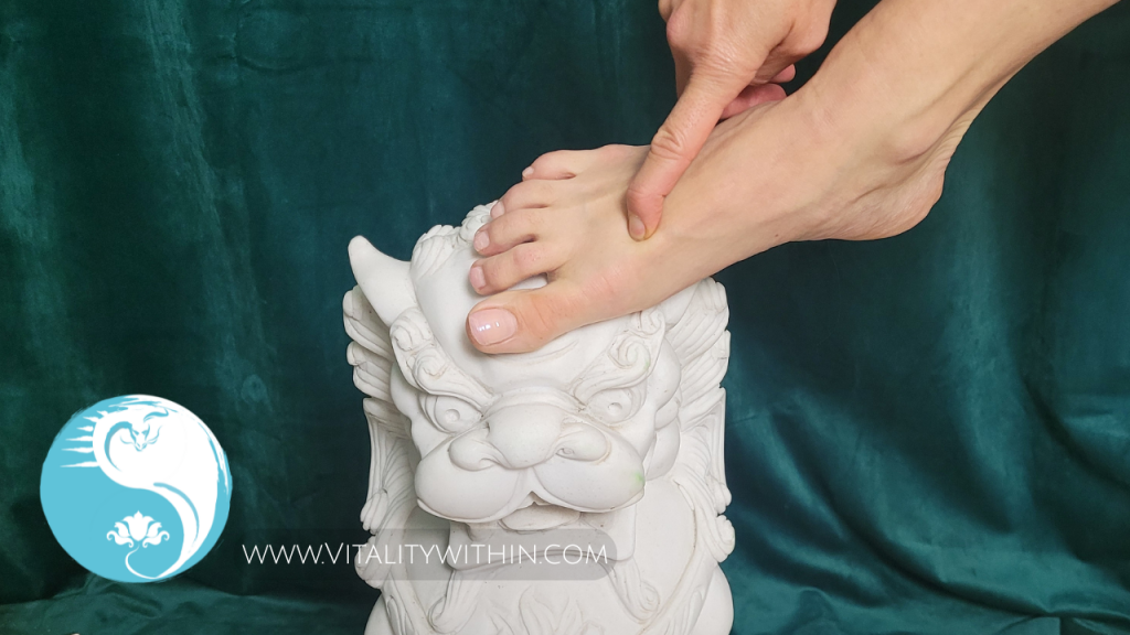 How to stimulate: Press as firmly as you can without too much discomfort, hold for 2 minutes per leg, twice a day. If the whole area is tender or appears a little swollen, you can also massage it from the direction of your toe towards the mid-foot.